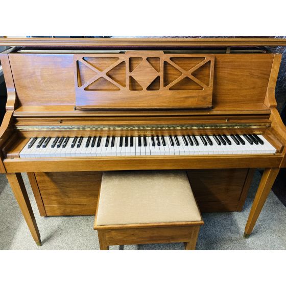 Uniquely styled quality upright piano, manufactured in England by Knight. Excellent overall condition, lovely warm tone, suit any level player looking for a solid rehearsal instrument that feels great to play, and doubles as a gorgeous furniture piece.